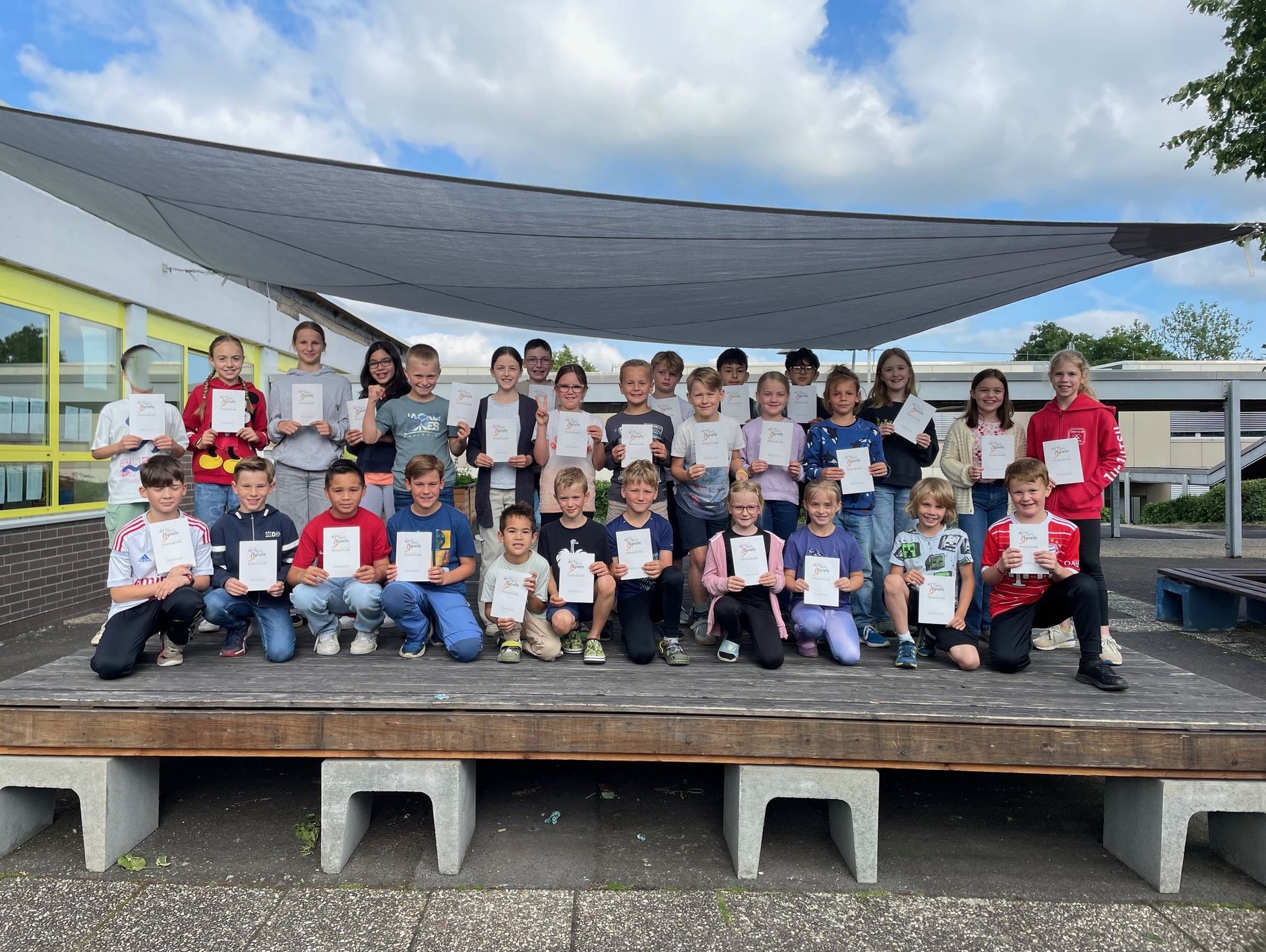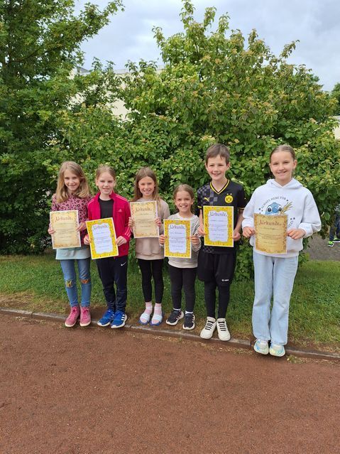 Insgesamt 45 Ehrenurkunden konnten kürzlich beim sportlichen Highlight des Jahres, nämlich bei den Bundesjugendspielen der Grundschule am Standort Runkel, an Kinder im Alter von sechs bis zehn Jahren vergeben werden. Zehn Klassen aus Runkel nahmen an den Spielen teil, zusätzlich reiste der Standort Arfurt an, um gemeinsam einen ereignisreichen Vormittag zu erleben. Dank des Engagements von über 25 Eltern, die tatkräftig an den Stationen mithalfen, konnten die Spiele reibungslos durchgeführt werden. Die Schülerinnen und Schüler traten in verschiedenen Disziplinen gegeneinander an – mit viel Spaß und Ehrgeiz. Beim Sprint mussten die Kinder zunächst eine 20 Meter lange Strecke mit Hürden bewältigen, um anschließend im Slalom möglichst schnell zurückzulaufen. Eine besondere Herausforderung, bei der viele Kinder über sich hinauswuchsen. Der Transportlauf forderte Ausdauer: In sieben Minuten galt es, so viele 200-Meter-Runden wie möglich zu laufen – für jede absolvierte Runde gab es ein Gummiband zur Belohnung. Beim Weitwurf warfen die Kinder in markierte Zonen: Die ersten und zweiten Klassen nutzten dabei 80-Gramm-Schlagbälle, während die dritten und vierten Klassen mit sogenannten "Heulern" antraten. Auch im Zonen-Weitsprung zeigten die jungen Sportlerinnen und Sportler beeindruckende Leistungen. Für das leibliche Wohl sorgten die Eltern mit großem Einsatz: 30 gespendete Kuchen und 100 Brezeln stärkten Teilnehmende und Helfende gleichermaßen. Ein weiterer Glücksfall: Während es an den Tagen zuvor immer wieder geregnet hatte, zeigte sich das Wetter an diesem Morgen von seiner besten Seite – bei strahlendem Sonnenschein wurde auf dem Sportplatz gelaufen, geworfen und gesprungen. Den gelungenen Abschluss bildete die Siegerehrung, bei der die erfolgreichen Talente für ihre besonderen Leistungen ausgezeichnet wurden.