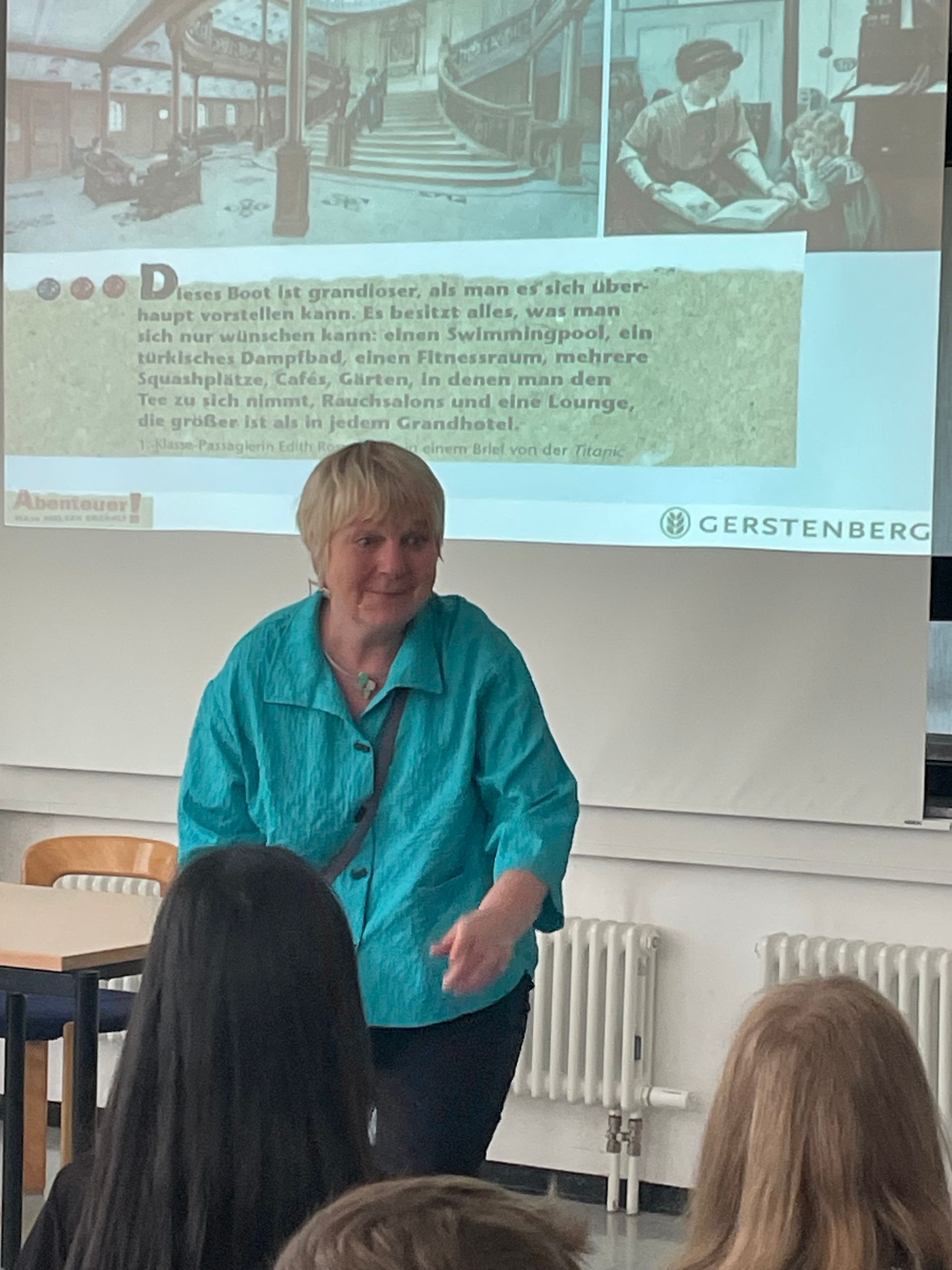 Wie bereits im Jahr 2023 hatte die Sachbuch-Autorin Maja Nielsen auch dieses Mal wieder ein spannendes Lese-Abenteuer für die dritten und vierten Klassen im Gepäck und konnte die Kinder von Beginn an begeistern. Mitreißend und sehr lebendig erzählte Frau Nielsen am 16.Juni vom Untergang der Titanic. Sie berichtete unter anderem über den zweiten Offizier, von einigen der damaligen Passagieren und dem menschlichen Versagen, welches letztlich die Ursache für das Sinken des über zweihundertfünfzig Meter langen Schiffes war. Einzelne Szenen bereicherte sie mit Hörbuch-Einspielungen. Auch erfuhren die Kinder anschaulich von der mutigen Musikkapelle des seinerzeit als unsinkbar geltenden Schiffes und dass diese bis zum Untergang spielte. Beim Zuhören konnte man sozusagen zum „Zeugen“ der dramatischen Ereignisse werden und es wurden Situationen geschildert, die uns Zuhörenden bis dahin unbekannt waren. Außerdem konnte sie berichten, dass wahrscheinlich in 25 Jahren nichts mehr von dem im Jahre 1912 gesunkenen Luxusschiff übrig sein werde, da Bakterien das Wrack seit bereits über einhundert Jahren auf dem Meeresgrund zersetzen. Alle Kinder hörten gebannt zu und fanden diese Lesung „cool“ und einfach „genial“ – wie man es von manchen Kindern anschließend hören konnte. Natürlich wurden auch die zahlreiche Fragen der Kinder geduldig von Frau Nielsen beantwortet. Die beiden Lesungen konnten aus dem Erlös des letztjährigen Schulfestes finanziert werden. An dieser Stelle sei nochmals ein großer Dank an alle Besucher und Besucherinnen unseres Festes ausgesprochen. Chr. Dillmann