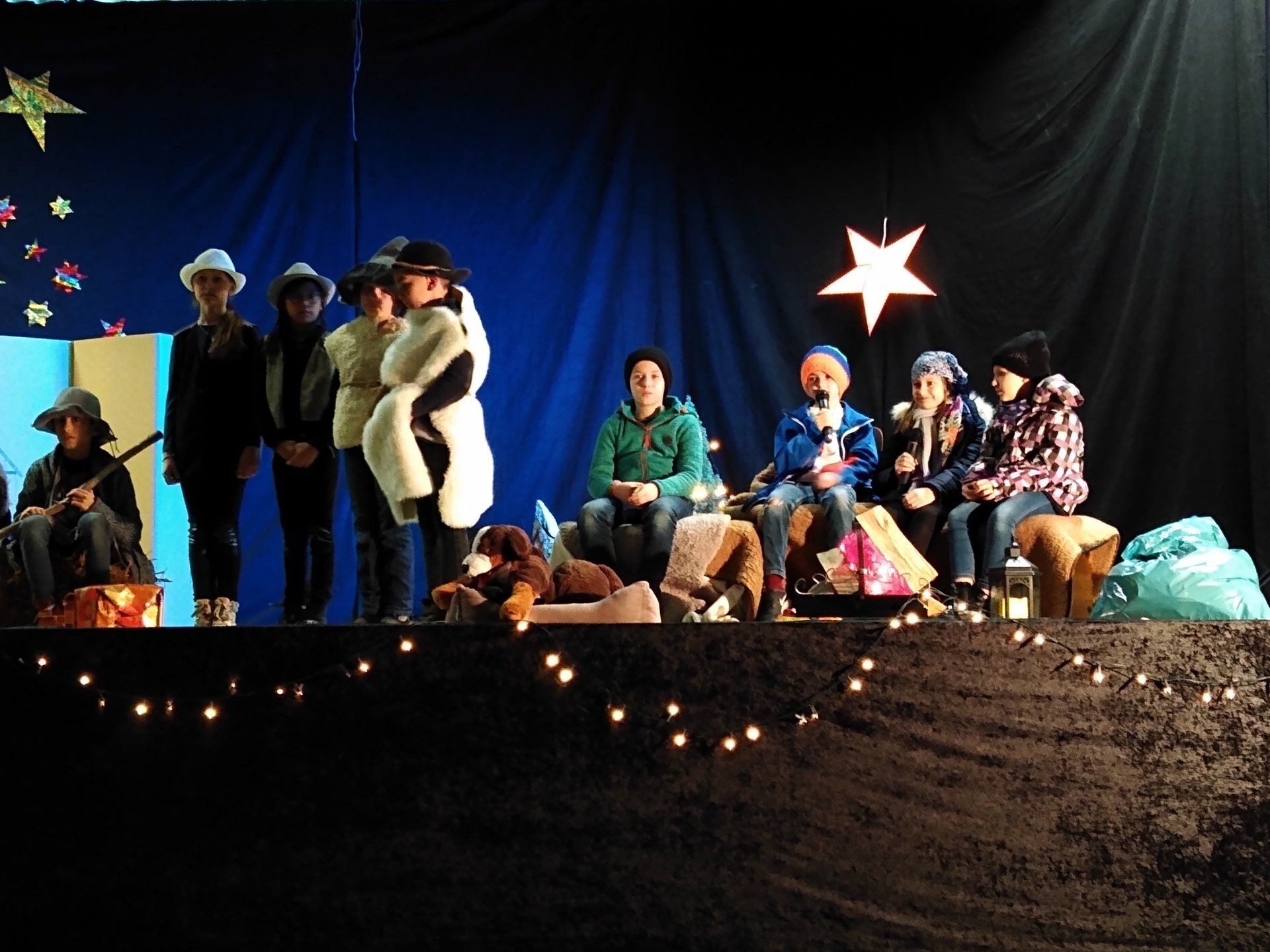 So lautet der Titel des diesjährigen Musicals, das die Klassen 3 und 4 der Runkeler Grundschule bei ihrer traditionellen Weihnachtsfeier aufführten. Gemeinsam mit ihren Klassenlehrerinnen Frau Kranz, Frau Meteling, Frau Schäfer und Frau Würz hatten die 75 Schüler in den letzten Wochen fleißig Sprech- und Liedtexte gelernt, Kostüme und Requisiten gesammelt oder selbst hergestellt und viele Male intensiv geprobt. Während auf der Nebenbühne der Obdachlose Otto mit Hilfe der Freunde Kira und Pascal der jungen Iranerin Suleila erklärt, was es mit Weihnachten auf sich hat, stellten die Spieler auf der Hauptbühne das Geschehen in Bethlehem vor 2000 Jahren dar: die empörte Reaktion des Volks, das sich der vom römischen Kaiser angeordneten Schätzung unterziehen musste (Lied „Wir warten hier seit Stunden“), die Herbergssuche von Maria und Josef („Viele Fragen begleiten diese Reise“), und die vertraute Krippenszene im Stall, in der die Hirten das neugeborene Jesuskind anbeten und beschenken. Und so stellt Suleila am Ende des Stückes zufrieden fest: „Ach so ist das, jetzt habe ich verstanden, warum ihr Weihnachten feiert!“ Das eingängige musikalische Repertoire, bei dem sich Sologesang und Choreinsatz ebenso wie melodiöse Weisen mit eher fetzigen Liedern bis hin zum Rap abwechseln, unterstrich die Szenen eindrucksvoll. Aber auch der stimmungsvolle Rahmen mit einer liebevoll gestalteten Kulisse, detailreichen Kostümen und einem professionellen Lichteinsatz trug maßgeblich zum Gelingen der Aufführung bei. Noch bei der Generalprobe am Vormittag wurde gefeilt und verbessert, aber als sich dann um 16.30 Uhr der Vorhang öffnete, klappte alles (nahezu) perfekt und die große Spiel- und Singfreude der jungen Darsteller übertrug sich schnell auf das Publikum aus Eltern und anderen Gästen. Und auch bei der zweiten Aufführung am Freitag gelang es den vier Klassen noch einmal, ihr Publikum zu begeistern, das sich diesmal aus den Klassen 1 und 2, den Vorschulkindern der Runkeler, Ennericher und Steedener Kindergärten, sowie einigen Klassen der Sekundarstufe 1 zusammensetzte.