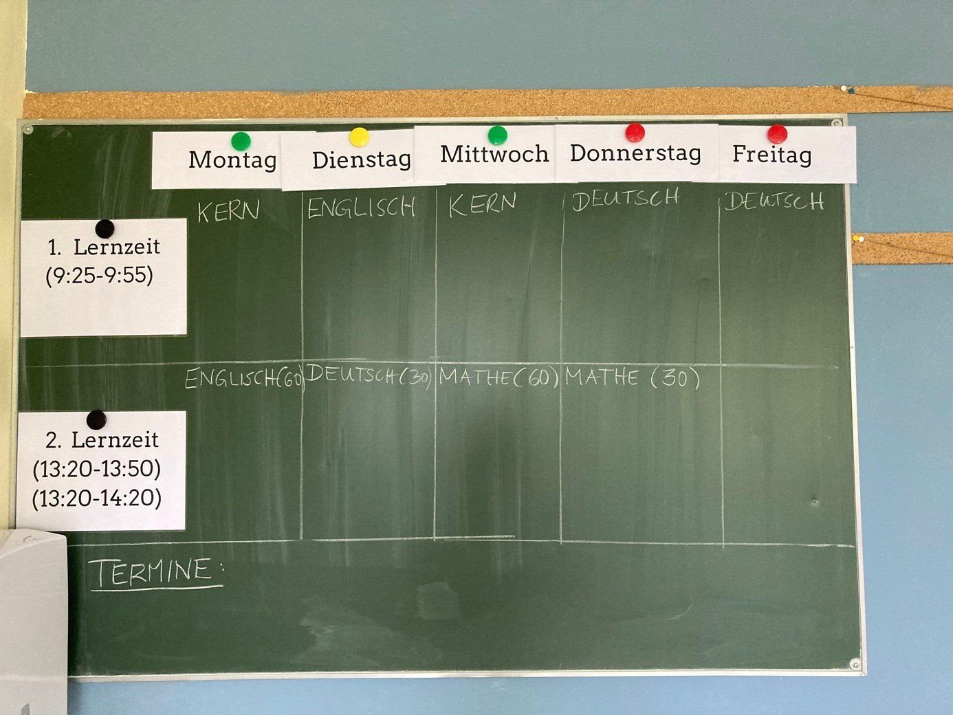 Die Lernzeit am Mittag wird von insgesamt zwei Pädagogen durchgeführt. Sie dient auch als zusätzliche Übungszeit für die Fächer Deutsch, Kern, Mathematik und Englisch und ersetzt die schriftlichen Hausaufgaben.