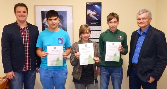 Im Hauptschulbereich siegte Lea Bagdadhi aus der 8d (im Bild Mitte). Fachbereichsleiter Jan Ruckes (links) lobte die Ergebnisse der Schüler und gratulierte den Schülern zu ihrem Erfolg. Direktor Michael Uhl betonte oie Wichtigkeit des Wettbewerbes und wünschte den Teilnehmern viel Glück für die nächste Runde, in der man sich mit anderen Schulsiegern auf Kreisebene messen wird.